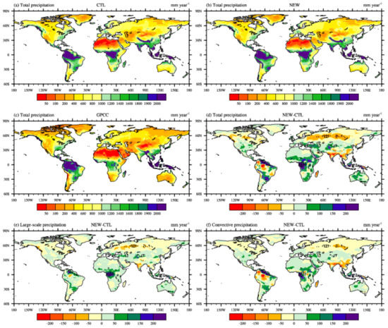 Figure 7 shows the spatial distribution of global 24-year mean precipitation. Both runs showed a similar pattern for global precipitation, consistent with GPCC data (Figure 7a–c), with the heaviest precipitation distributed mainly in tropical regions, the Americas, and the east coast of Asia, which is affected by the summer monsoon and typhoons. However, North Africa, arid deserts, and the polar regions had relatively less precipitation. The differences in total precipitation between the two experiments were mainly concentrated in tropical regions. In the northeastern part of the Amazon and the west coast of Africa, total precipitation increased by 200 mm year−1, and in South America, central Africa, and Indonesia, total precipitation increased by 50 to 100 mm year−1 (Figure 7c). Compared with the GPCC, the new scheme partly overcame the underestimation of total precipitation over the northeastern Amazon, Indonesia, and the overestimation over south Asia. Figure 7d,e show the difference in large-scale and convective precipitation between NEW and CTL respectively. It is obvious that both large-scale and convective precipitation have consistent changes with regard to the total precipitation. In the northeastern Amazon, convective precipitation contributes more to the increase in total precipitation, which implies that in this area local climate changes result in the more frequent occurrence of convective weather, and in the west coast of central Africa large precipitation events contribute more to total precipitation.