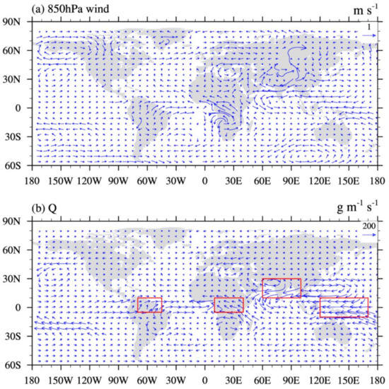 Twenty-four-year (1982–2005) mean difference of: (a) 850 hPa wind field (m s−1); (b) water-vapor flux (g m−1 s−1).