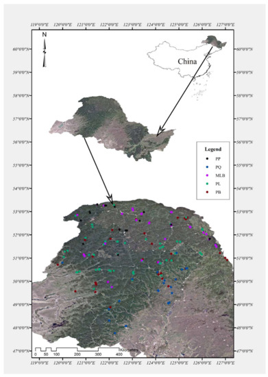 The forest in the Daxing’an Mountains is one of the most important areas in China: the lush natural forest is distributed widely. It is an important production base for forest trees in China, and also an important ecological barrier in northeastern China. The study area comprises about 86,000 km2 and belongs to the cool coniferous forests. The investigated forest plots are shown in detail in Figure 1 [17]. Five main forest types were chosen, including pure Larix gmelinii (Rupr.) Kuzen forest (PL) (87 samples, altitude: 235–1023 m), pure Betula platyphylla Suk. forest (PB) (64 samples, altitude: 160–1003 m), pure Quercus mongolica Fisch. ex Ledeb. forest (PQ) (36 samples, altitude: 240–771 m), Larix gmelinii (Rupr.) Kuzen and Betula platyphylla Suk. mixed forest (MLB) (25 samples, altitude: 247–1038 m) and pure Pinus sylvestris L. var. mongolica Litv. forest (PP) (18 samples, altitude: 296–905 m). The study was conducted in the eastern forest zones of the Daxing’an Mountains area (45°59′–53°19′ N, 119°47′–130°53′ E), Heilongjiang Province and Inner Mongolia Autonomous Region. This region has a continental monsoon climate, and receives a mean annual precipitation (MAP) of 764 mm. The temperature varies between −41 °C in January–February and 35 °C in July–August, with a mean annual temperature (MAP) of −2.8 °C.