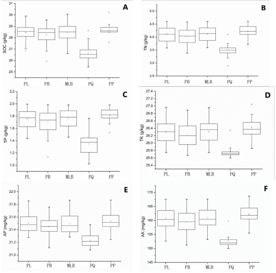 Variation of soil properties in different forest types. SOC = soil organic carbon, TN = total nitrogen, TP = total phosphorus, TK = total potassium, AP = available phosphorus, and AK = available potassium. PP = pure Pinus sylvestris L. var. mongolica Litv. forest, PQ = pure Quercus mongolica Fisch. ex Ledeb. forest, MLB = Larix gmelinii (Rupr.) Kuzen and Betula platyphylla Suk. mixed forest, PL = pure Larix gmelinii (Rupr.) Kuzen forest, PB = pure Betula platyphylla Suk. forest. A, B, C, D, E and F were respectively represent for SOC, TN, TP, TK, AP and AK content of five forest types. “□” = average value, “×” = outliter.
