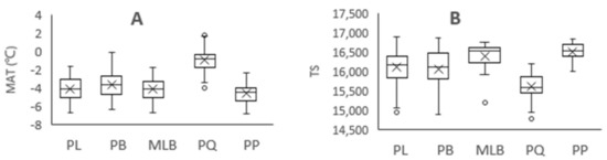 The averages of the MAT and MAP were −1.74 °C and 534.93 mm, respectively; the ranges of the TS and PS were 14,772–16,885 and 95–116, respectively (Figure 3). MAT and PS were higher in the PQ than in the other four forest types, while TS showed the opposite trend (Figure 3).