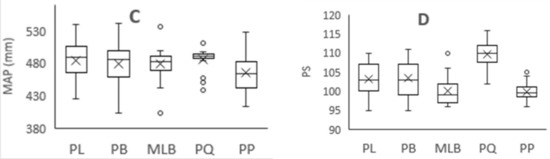 Variation of climatic factors in different forest types. MAT = mean annual temperature, TS = temperature seasonality, MAP = mean annual precipitation, and PS = precipitation seasonality. PL = pure Larix gmelinii (Rupr.) Kuzen forest, PB = pure Betula platyphylla Suk. Forest, MLB = Larix gmelinii (Rupr.) Kuzen and Betula platyphylla Suk. mixed forest, PQ = pure Quercus mongolica Fisch. ex Ledeb. forest, PP = pure Pinus sylvestris L. var. mongolica Litv. Forest. A: MAT of five forest types, B: TS of five forest types, C: MAP of five forest types, D: PS of five forest types. “×” = average value, “○” = outliter.