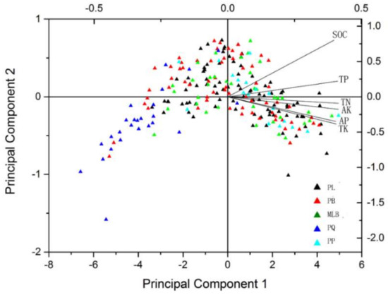 The relationships between soil nutrients and forest types have been presented previously [3]. In addition, northeastern China has been considered as one of the regions with the most abundant soil nutrition [16,33]. To confirm the influencing trends of the variation of soil nutrient contents to forest types, PCA was carried out on the collected data. From the distribution of the loading plot in the PCA space, it was found that the forest type influenced the soil nutrients. For instance, SOC, TP, TN, AK, AP and TK were higher in PL, PB, MLB and PP in this study, while these soil nutrients showed the opposite trend. So, we suspect that there were certain correlations between soil nutrients and forest type. In addition, the differences caused by vegetation effects in the responses of the nutrients may be due to slight distinctions in parent material in different forest types [34,35].