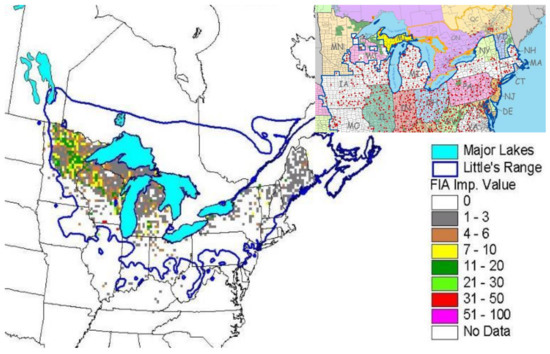 Geographic distribution of black ash in the United States from Forest Inventory and Analysis databases. Little’s range is the geographic range of black ash based on botanical lists, forest surveys, field notes, and herbarium specimens [11]. The Forest Inventory and Analysis importance value is a measure of the abundance of a species within a stand. An importance value of 50 indicates that the stand is 50% black ash and 50% other species. Inset is the geographic distribution of emerald ash borer detected in counties as of 1 March 2018 [12].