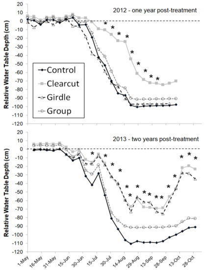 Weekly mean (n = 6) water table depth relative to ground surface by treatment from the Minnesota sites. The control treatment comprised unharvested reference sites, the clearcut treatment was a commercial harvest, trees were girdled in the girdled treatment, and group treatment was a group selection harvest creating gaps of approximately 0.04 ha. Each year’s growing season was analyzed separately; weeks with an * indicate significant differences among treatments (p < 0.05). There were no differences among treatments prior to treatment application (p > 0.2) (reproduced from Slesak et al. [8]).