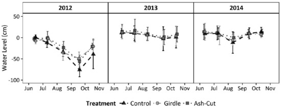 Mean wetland water table levels relative to the wetland soil surface, with 95% confidence intervals, during the snow-free period for the upper Michigan sites (n = 3). The year 2012 was the pre-treatment year and 2013–2014 were the first two post-treatment years (reprinted from Van Grinsven et al. [7]). The control treatment comprised unharvested reference sites, all ash trees were girdled in the girdle treatment, and all ash were cut and left on the ground in the ash-cut treatment.