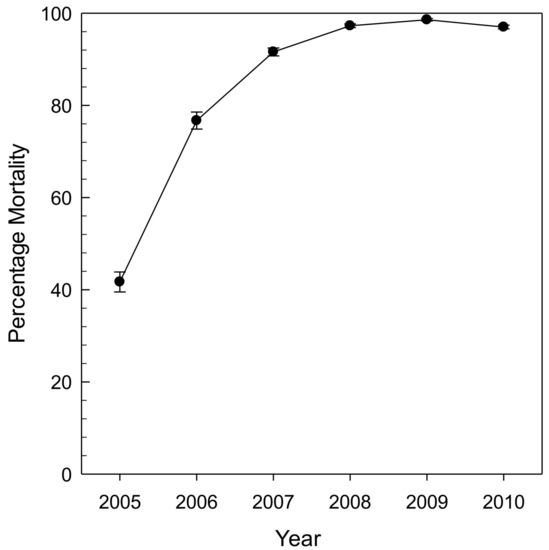Percentage of ash mortality of trees >2.5 cm at 1.37 m height in subplots and >12.5 cm at 1.37 m height in main plots from 38 stands that included black, green, and white ash in the Huron River watershed in lower Michigan (reprinted with permission, [27]).