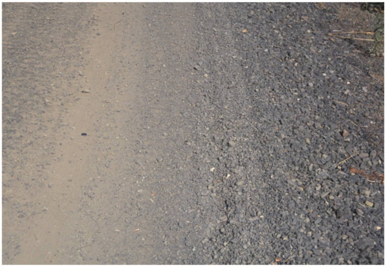 In addition to crushing and subgrade mixing, there is another traffic-induced process that alters forest road aggregate. Traffic moves loose aggregate material off the road by tire action [15], which is called “sweeping”. Traffic-induced sweeping results in the movement of loose aggregate particles to the roadside and shoulder. This is particularly prevalent at sharp corners where road surface aggregate tends to accumulate at the roadside (Figure 1) [11,16,17]. Two extreme cases of sweeping can be considered: sweeping-out (losing large-size particles, such as gravel, near tire tracks) and sweeping-in (receiving large-size particles near the shoulder).