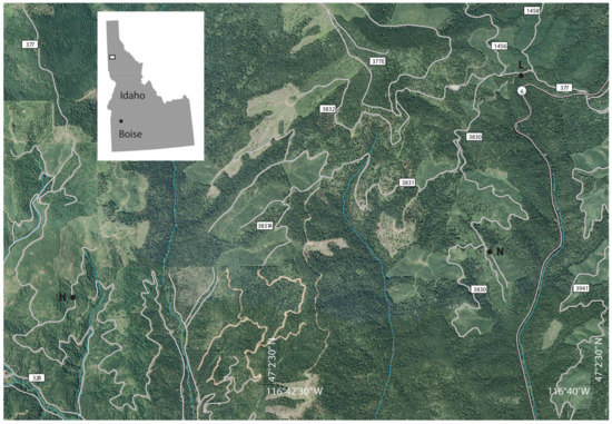 Location of the study plots on the White Pine roads in the Clearwater National Forest, Idaho. The map was modified from the 1:24,000 US topographic map (West Dennis, Idaho; 7.5-min quadrangle map) with orthoimage [32]. N, L, and H indicate the plot locations on no, light, and heavy traffic use roads. The N was used for log-hauls after collecting the samples, and the H, before collecting the samples in this image. White lines without a border indicate a forest road network; the white line with borders at the right side indicates the Idaho state highway 6; and blue lines indicate streams.