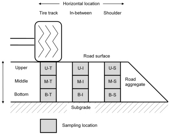 For each road traffic treatment, we collected aggregate samples from three vertical layers (upper (U), middle (M), and bottom (B)) at three horizontal locations (tire track, shoulder and in-between) to be able to capture the trends in aggregate changes by traffic (Figure 3). Tire track, T, was located 1.2 m from the outside edge of the shoulder; shoulder, S, was located 0.3 m from the outside edge; and in-between, I, was located half-way between T and S. Vehicles and equipment, especially ones with trailers and wide axle widths, could pass over all three horizontal locations, including the shoulder. Samples were collected to an aggregate depth of 0.1 m, resulting in an aggregate sampling depth of 33.3 mm which was deep enough to include the largest aggregate particle (25.4 mm diameter). When a large particle was found near the 33.3 mm depth, it was included in the layer with a larger proportion of that particle size. Aggregate samples in the bottom layer were collected down to the subgrade layer. Replicate cross-sections on each of the three roads were approximately 0.5 m apart.