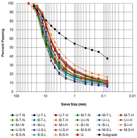 The particle-size distributions (PSDs) of the forest road aggregates and subgrade from the White Pine roads in the Clearwater National Forest and the quarry (Q) in Idaho. The abbreviations indicate different vertical layers (upper (U), middle (M), and bottom (B)), horizontal locations (tire track (T), in-between (I), and shoulder (S)), and traffic uses (no (N), light (L), and heavy (H)). The particle-size distributions changed by crushing did not get finer than a certain limit, close to the particle-size distribution curves at U-I-H or B-I-H, except the particle-size distribution at B-S-H where subgrade mixing likely occurred in addition to crushing. The road aggregate PSDs were based on average values of 5 replications [48]; the quarry, 12 replications; and the subgrade, 4 replications at B-S-H.
