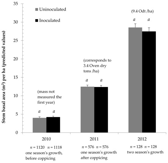 The experiment found no productivity difference between uninoculated and inoculated plantation willows. As Figure 1 shows, during the first 2 years, when the most trees were measured, no difference was shown between the observed results and inoculation treatment predicted mean SBA/ha values. Similarly, while the third year had fewer measured trees, and did seemingly see a small difference between SBA/ha mean predicted values, this difference was not statistically significant. This result held true whether tree height was measured, or whole trees were cut down and weighed (see Supplementary Material, Tables S1–S10).