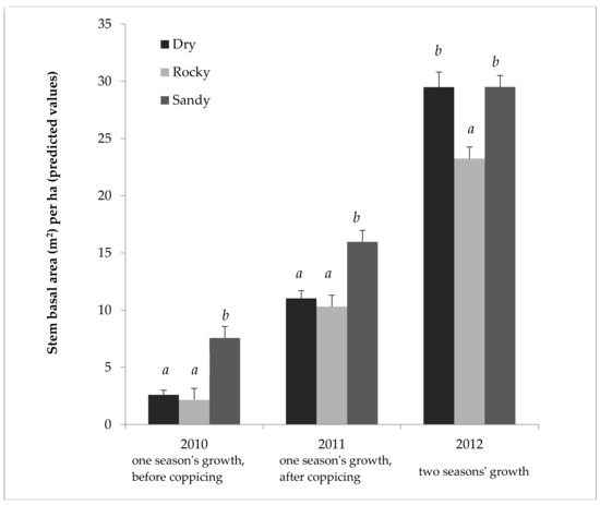 Cumulative growth of Salix miyabeana (‘SX61’ and ‘SX64’) during establishment on marginal land, in three different fields. Stem basal area predicted values (untransformed) and test results (LOG transformed) by field for all three years. Note: 2012 represents only one cultivar type (‘SX61’), because of treatment interaction; however, 2010 and 2011 are the full model. Error bars are standard errors. Letters (a, b) above the bars indicate that the Tukey’s test found a significant difference (p < 0.05) between predicted means for each field (a separate analysis each year). n = 768 each for Normal and Rocky fields in 2010; n = 704 for Sandy field in 2010; n = 384 in 2011 for each field; n = 96 in 2012 for each field.