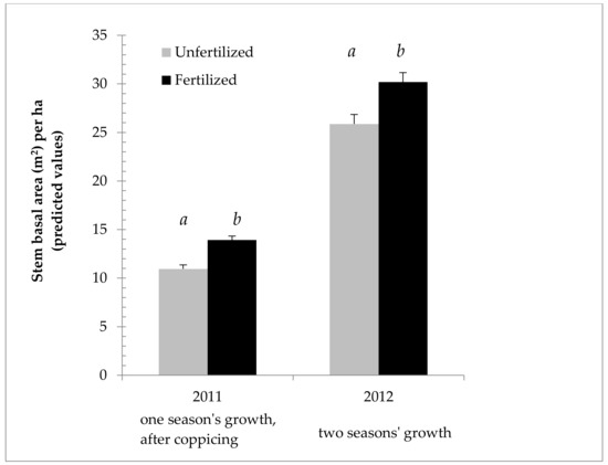 Cumulative growth of Salix miyabeana (‘SX61’ and ‘SX64’) during establishment on marginal land. Stem basal area predicted values (untransformed) and ANOVA results (LOG transformed) for the year in which fertilization treatment was applied (2011), as well as for the following year (past growth, plus any residual nitrogen in the soil). Note: Error bars are standard errors. Different letters (a, b) above the bars indicate a significant difference (p < 0.05). n = 576 in 2011 for each fertilization treatment; n = 144 in 2012 for each fertilization treatment.