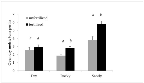 Cumulative growth of Salix miyabeana (‘SX61’ and ‘SX64’). Oven dry tons per ha predicted values (untransformed) by field for 2011. Note: Error bars are standard errors. Different letters (a, b) above the bars indicate a significant difference (p < 0.05). The ANOVA (performed on LOG transformed values), including all variables in the model, found a likely interaction between field and fertilization, prompting the breakdown by field. n = 192 for each field and fertilization treatment.