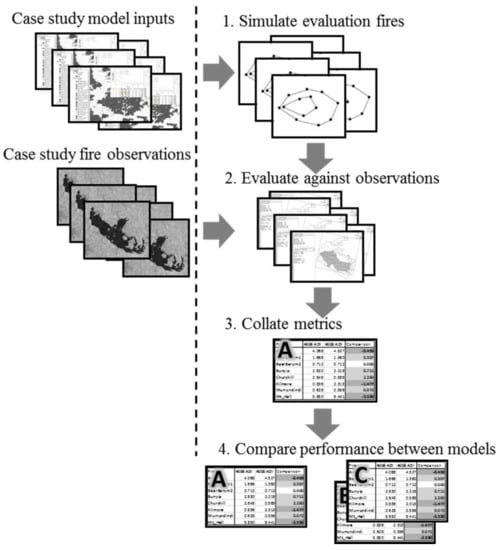 The following procedure was undertaken to compare the two model versions: compile an evaluation set of wildfires, simulate each fire with each model, quantitatively compare simulations against equivalent fire observations, and compile fire metrics to compare overall model performance. This procedure can compare models with very different formulations or requirements, as long as all necessary simulation model inputs are available. The procedure is presented graphically in Figure 1. Each stage is described in further detail below.