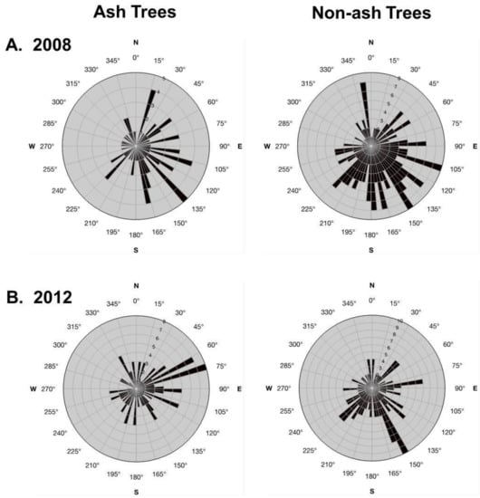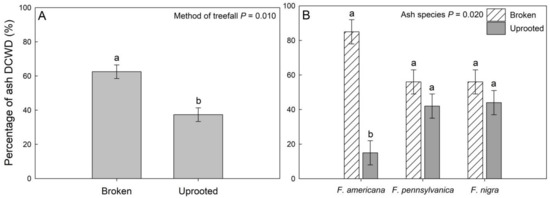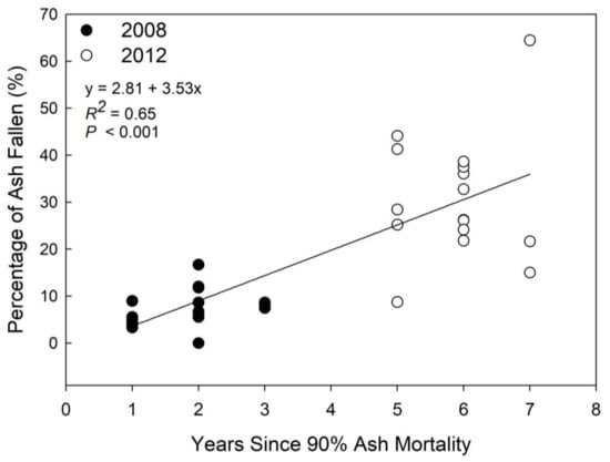 | Percentage of ash trees that had fallen | 7.6 ± 1.0 a | 30.7 ± 3.3 b |