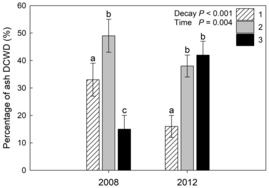 | Volume of ash DCWD (m3 ha−1) | 17.2 ± 3.3 a (17.0%) | 36.6 ± 4.1 b (27.2%) |
