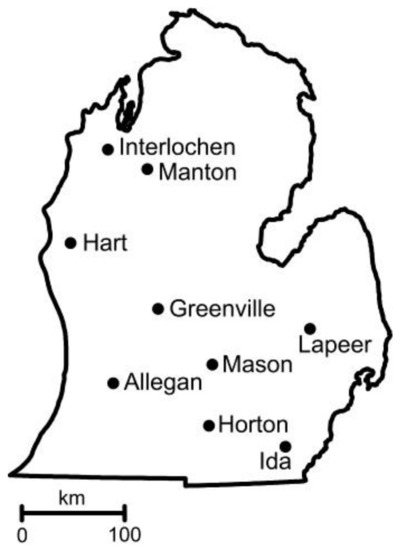 Locations of Christmas tree farms that cooperated in the 2011–2013 phenology study in Michigan. Coordinates for each site are presented in Table 1.