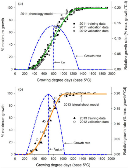 Fitted and validated (a) 2011 phenology model of leader growth and (b) 2013 phenology model of lateral shoot growth. Models are fitted using a beta sigmoid function (BSF). The time of maximum growth rate is indicated by Tm for terminal leader growth or TmLat for lateral shoot growth. Each symbol indicating training and validation data represents mean growth of 25 trees at one of the measurement sites. Note that predicted shoot growth is the same in every year because the models are based on GDD and not calendar or Julian date.