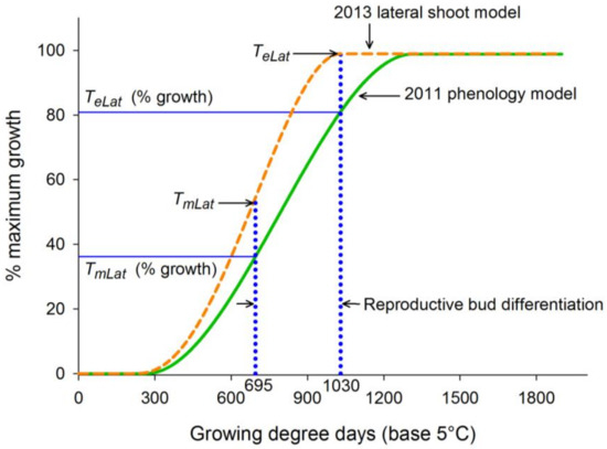 To incorporate lateral shoot phenology into our 2011 phenology model, we first fit the beta sigmoid function to the 2013 lateral shoot data, and then temporally validated that 2013 lateral shoot model using the 2012 lateral shoot data. From the trained and validated model, we derived (1) the time of maximum growth rate (), after which reproductive bud initiation occurs; and (2) the time of lateral growth cessation (TeLat), marking the end of reproductive bud anatomical differentiation. We then mapped and to the 2011 phenology model, which allows us to visualize the period of reproductive bud development in terms of leader growth. We followed the same methods to fit the lateral shoot model as we used to fit the 2011 phenology model, including normalizing lateral growth data as percent maximum growth prior to fitting the model.