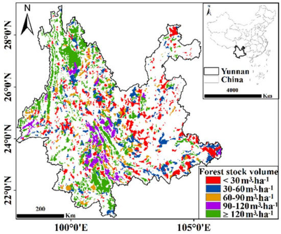 Distribution of forest stock volume densities in Yunnan province, China [40].