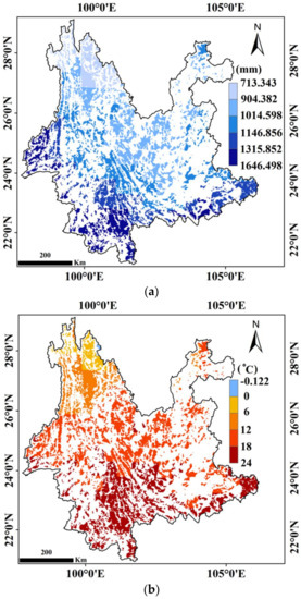 Yunnan Province (21.13°–29.25° N, 97.51°–106.18° E) is located in southwestern China (Figure 1), and primarily has a subtropical monsoon, plateau monsoon, and tropical rainy climate. The precipitation and temperature of Yunnan Province show a regular change where both decrease gradually from south to north (Figure 2a,b); this is related to the water resource and the latitude location. Based on the data mentioned above, the research found that Yunnan Province, with a mean annual precipitation (MAP) of 1098.6 mm and a mean annual temperature (MAT) of 15.7 °C, is warm and humid in general. In addition, the precipitation and temperature are concentrated in summer (June–August) [10], and therefore it is a typical high-coverage region in China, where the forest cover is greater than 50.0% [39]; forests with various stock volume densities are widely distributed (Figure 1) [40], and the best status of forests grow mainly in summer (especially in July) [10]. From 2001 to 2014, large areas of Yunnan suffered many drought events (2005–2006, 2009–2014) with varying intensities and duration, which significantly affected the forest ecosystem [10,41,42]. Typical drought events in Yunnan include the mild drought of 2005 and the persistent drought in winter of 2009 to spring of 2010 [10,41]. Yunnan Province is currently a focus study region for exploring how the forest responds to drought as it has a high forest cover rate and has suffered several drought events [43,44], especially from 2001–2014. Due to all of these reasons, Yunnan Province was selected as the study region.