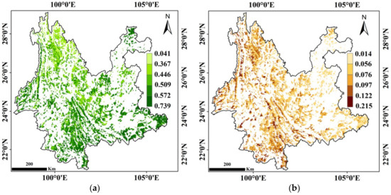 Compared with the NDVI, the EVI is more sensitive to information from high-coverage regions and is therefore less likely to be saturated [33,51]. As the research region (Yunnan Province, southwest China) of this study is a typical high-coverage region in China (where forest cover is greater than 50%) [39], EVI is more suitable than NDVI to characterize the forest growth status in the present research. In addition, the moderate imaging spectroradiometer (MODIS) not only has the time continuity of data, but its spatial resolution can also meet the needs of research in the medium scale [33,44]. Thus, the MOD13A1-EVI product from the land processes distributed active archive center, which is provided every 16 days at a resolution of 500 m, was chosen for the present research [52]. The monthly EVI was obtained as a composite of many EVI diagrams for each month and expressed as the maximum value composite (MVC) [53]. To match the forest data, the EVI was resampled to 1 km using ArcGIS (ver. 10.2) (Esri, Environmental Systems Research Institute, New York, NY, USA). As July is the most conducive for forest growth, and the trees in this month are most sensitive to moisture status [10,28], only the EVI for July in each year was selected to represent the status of forest growth in that year. Furthermore, the start time of the MOD13A1-EVI was 2001 [52], and the deadline of SPEIbase ver. 2.4 (the Climatic Research Unit (CRU)) was 2014 [46]. In addition, Yunnan had several dry years (2005–2006, 2009–2014) and wet years (2001–2004, 2007–2008) during 2001 to 2014 [10,41,42], so the 2001–2014 databases were selected in this research. From the spatial distribution of the mean annual EVI during 2001–2014, a large spatial difference in forest growth status (Figure 3a) was found, which could be due to the distribution of different forest stock volume densities as many researchers have shown a positive relationship between forest stock volume density and EVI [54]. The variation in forest growth status shown by the annual standard deviation of EVI (Figure 3b) could be driven by external stresses such as drought.
