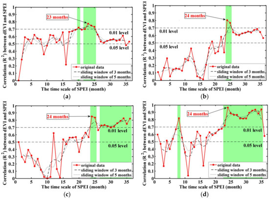 By comparing the association strength between the SPEI at multiple time scales and dEVI, the research selected the optimal time scale for SPEI. Taking into account the differences in hysteresis (as related to water balance) between the different stock volume densities, the impact of drought could be assessed more accurately. In determining the optimal time scale for SPEI, linear regression models (SPEI-dEVI) between the SPEI on 1–36 month time scales and the dEVI of forests with five groups of stock volume density were constructed, and 180 regression models were generated in this exercise. Next, according to the significance (at the 0.01 level) and the R2 of the linear regression models, the optimal time scale and the corresponding SPEI (SPEIopt) were determined. To ensure the selected time scale and the corresponding SPEI were truly representative and robust, the average values of R2 in these regression models, between the SPEI on adjacent time scales and dEVI, were used as references; in other words, sliding windows of three months and five months were used to confirm the average value of R2 on adjacent time scales. To reduce the interference from miscellaneous data, the average values of SPEI and dEVI in every grade of drought (eight grades) [64] (Table 1), were used as the base data for the linear regression models.