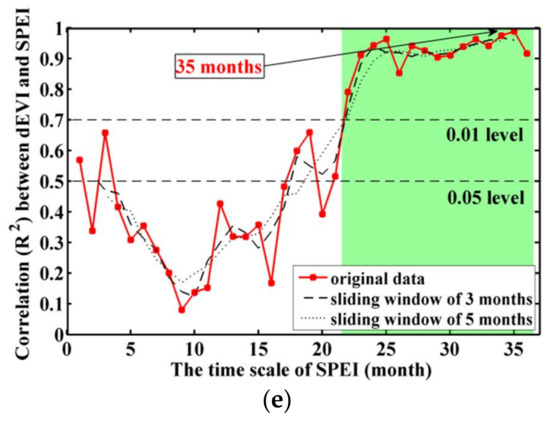 Correlation between dEVI and the SPEI at different time scales for forests with five groups of stock volume density (m3·ha−1): (a) <30; (b) 30–60; (c) 60–90; (d) 90–120; and (e) ≥120. The green highlight shows significance at the level of 0.01.