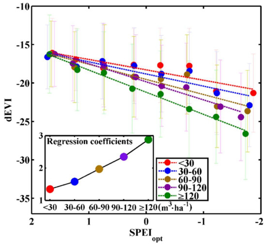 Based on the analysis of the linear regression between the SPEI at 1–36 month time scales and the dEVI of forests with different stock volume densities, the optimal time scale of SPEI (SPEIopt) was determined, and the optimal model that best simulated the response of the vegetation to water, as judged on the basis of SPEIopt, was determined (Table 2). Models for the optimal time scales showed the maximum variance interpretation rate (R2) and therefore reflected to the fullest extent the relationship between meteorological drought and physiological drought. Irrespective of the forest stock volume density, the dEVI reflecting forest growth status decreased gradually as the intensity of the drought increased. In addition, it was found that the R2 of a model increased gradually as the stock volume density increased (Table 2). Furthermore, the sensitivity of dEVI to changes in the moisture status also increased as the stock volume density increased; that is, a unit change in the moisture content caused a greater reduction in the dEVI for forests with higher stock volume densities (Figure 5). Thus, the relationship between drought stress intensity and its effects on forests was stronger, and forests were more sensitive to changes in soil moisture when the forests had high stock volume densities—their resistance to such changes was weaker during times of drought.