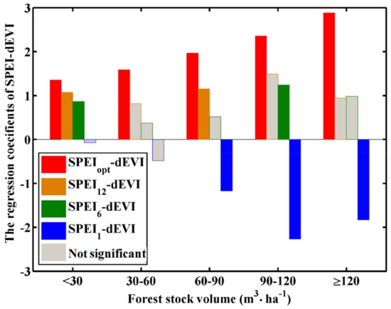 If the differences in terms of stock volume were ignored, and if the SPEI that was assigned artificially to a fixed time scale was used for simulating the response of vegetation to drought, the following problems arose. First, the relationship between changes in the SPEI and those in the EVI was represented incorrectly, as evident from the negative correlation between the SPEI at a 1-month time scale and dEVI (SPEI1-dEVI in Figure 6), as precipitation in the current month only had a limited effect on forest growth [29]. Excess precipitation is always accompanied by a decrease in photosynthetically active radiation and by lower temperatures, so forest growth is affected adversely [26]. Second, the relationship between SPEI and dEVI was revealed correctly, but the significance level and the statistical significance of the model were underestimated (grey icon in Figure 6). Third, despite overcoming the above two shortcomings, the model parameter that reflected changes in the dEVI, which changes with the drought stress intensity, was potentially underestimated, and therefore forest growth sensitivity to drought as a result of climate change (Figure 6).