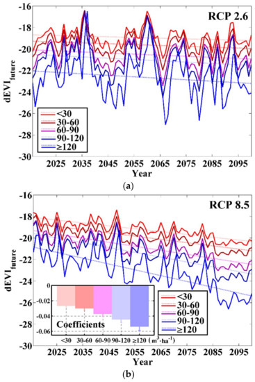 Based on the variations in the SPEI under the different climate change scenarios, a linear regression model was constructed to show the relationship between SPEIopt and dEVI for all groups of forest stock volume density. Next, the variations in dEVIfuture were simulated, and the relative climate change risks facing forests were compared between different forest stock volume densities. The predicted values (dEVIfuture) were affected by the drought stress intensity and by the stock volume (Figure 7a,b). Drought was more severe under the high-concentrations scenario (RCP 8.5) than under the low-concentrations scenario (RCP 2.6). Thus, the dEVIfuture showed a clear downtrend (p < 0.05) under the high-concentrations scenario (Figure 7b), but not under the low-concentrations scenario (p < 0.05) (Figure 7a). On the other hand, the variations in the dEVIfuture—irrespective of the scenario, whether RCP 2.6 or RCP 8.5—were greater when the stock volume density was higher as forests with high stock volume density are more sensitive to moisture levels.