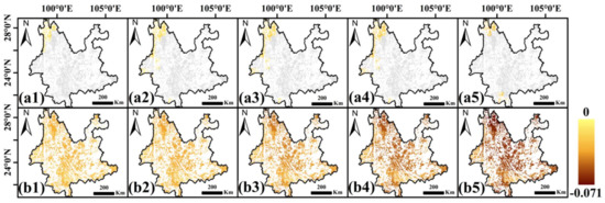 Pattern of spatial variation in the coefficient of the temporal variation trend of dEVIfuture following global climate change. (a1–a5) show the coefficients of <30, 30–60, 60–90, 90–120, and ≥120 (m3·ha−1), respectively, at every spatial grid in the climatic scenario of RCP 2.6, and the proportion of grids at the significance level of 0.05 to the total number of grids was 6.8% in the case of densities below 30 m3·ha−1, 11.5% in each of the next three categories, and 5.7% in the case of densities greater than or equal to 120 m3·ha−1; (b1–b5) show the corresponding values under Scenario RCP 8.5.
