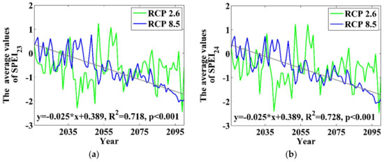 The forest drought response under the two scenarios depends on the forest stock volume density. Forest growth was affected adversely owing to annual fluctuations in moisture under the low-concentration scenario RCP 2.6, and the scenario showed no marked changes with time (Figure 7a). However, under the high-concentration scenario RCP 8.5, aside from the annual fluctuations, forest growth also decreased markedly over time (Figure 7b). To explore the reasons for the above differences between the two scenarios, the annual average values of the SPEI at different time scales (23, 24, and 35 months) in all regions were compared. Whereas the meteorological drought index under Scenario RCP 2.6 changed little over time (Figure 9), that under Scenario RCP 8.5 decreased markedly over time (Figure 9). This shows that the intensity of drought will increase under the high-concentration scenario, which is the reason for the differences in outcome between the two scenarios, and also the reason for the gradual deterioration of all forest-growing states over time. Forests with a high stock volume density will be affected more than those with a low stock volume density by a drought of a given intensity and will also be more sensitive and vulnerable to it (Figure 7b).