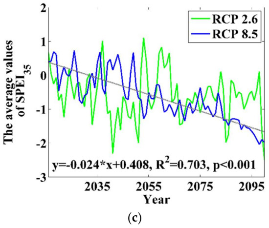 Changes in SPEI over time under scenarios RCP 2.6 and RCP 8.5 on time scales of (a) 23 months; (b) 24 months; and (c) 35 months. The 24 months represent the optimal time scale of SPEI for the three groups of stock volume density: 30–60, 60–90, 90–120 m3·ha−1.