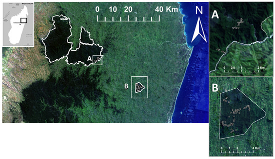The location and proximity of the forest inventory plots in Zahamena National Park (ZNP) and Betampona (BTP). Inset box (A) indicates the locations of the 35 plots in ZNP as white dots, with the boundary of ZNP shown in white. The boundary of BTP is outlined in white in inset box (B), with white circles representing the locations of the 100 inventory plots.