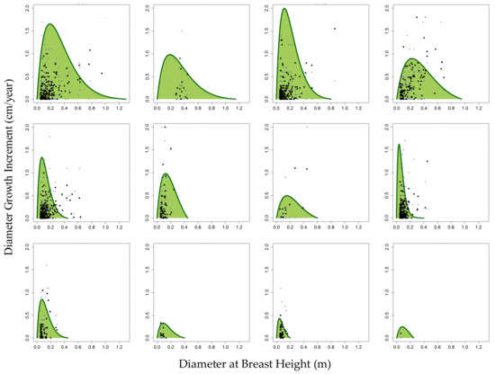 Maximum growth curve comparison among species groups for Betampona (BTP) 2004–2005 (blue points); 2004–2008 (black points). The points represent individual trees within each plant functional type during the year corresponding to the dot color. Growth curves were fit to each plant functional type (in green), the equations of which were the growth functions used in the model parameterization. PFT: Plant Functional Type. Top row from left to right: PFT 1, PFT 2, PFT 3, and PFT 4. Middle row from left to right: PFT 5, PFT 6, PFT 7, and PFT 8. Bottom row from left to right: PFT 9, PFT 10, PFT 11, and PFT 12.