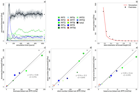 The model accurately reproduces aboveground biomass (t/ha; r2 = 0.976), stem numbers (r2 = 0.895), and basal area (m2/ha; r2 = 0.995) for the BTP study site (Figure 3a–e). The >10 cm simulated trees match well for the smaller statured plant functional types (PFT5-PFT12). Aboveground biomass in the simulation was slightly overestimated for the main canopy and emergent intermediate trees, and slightly underestimated for the main canopy and emergent shade tolerant trees.