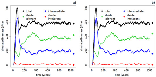 (a) Time series showing simulated biomass among the successional groups (shade intolerant, intermediate, shade tolerant) for 1000 years of simulation, as compared to Betampona forest (dots); (b) The same figure as on the left but comparing succession groups to Zahamena forest.