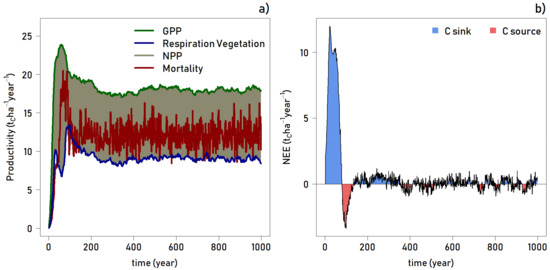 (a) Gross primary productivity (GPP), respiration, net primary productivity (NPP), and biomass mortality through time for the Madagascar rainforest simulation (50 ha forest area); (b) The net ecosystem exchange (NEE) time series for the Madagascar rainforest simulation. The shading refers to points in time where the simulated forest is a carbon source (blue) and a carbon sink (red) through the 1000-year timespan.
