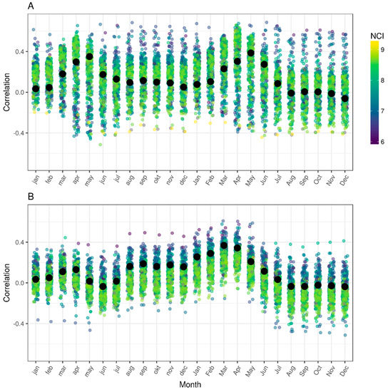 Jitterplot of (A) Pearson correlation coefficients of the raw tree-ring width with the SPEI9 for individual trees (small colored points) and for the mean population chronology (big black points). The neighborhood competition index (NCI) was used as color scale for individual trees; (B) the same correlations as in (A), but using detrended ring width (tree-ring indices (TRI)) and SPEI9 time-series (30-year cubic smoothing spline and ring width was additionally prewhitened).