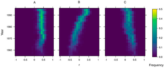 Heat maps were used to assess ‘individual tree moving window climate correlations’, and described the frequency distribution of correlation values in each time window (3D histograms). Figure 2 shows three examples of the general patterns that heatmaps can provide, in particular, stability over time, changes over time, and variance differences between climate variables. For example, climate correlations were comparatively strong and stable over time, showing no changes in mean, variance, and skewness of the distributions for April SPEI9 (Figure 2A). However, more frequently, these distribution parameters changed over time (e.g., June temperature, Figure 2B). Typically, these distributions were normally distributed at mean correlation values around zero, and became skewed toward zero at higher or lower mean values. The variance can also differ slightly between climate variables, as shown in Figure 2A,C, though much larger variances can be found at other sites (not shown).