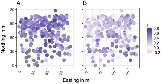 Spatial distribution of the correlation coefficients of individual TRI with April SPEI9. (A) shows the correlation for the period 1969–1988 and (B) for the period 1989–2008. Grey dots show trees for which no climate correlations could be calculated due to young age and thus insufficient data in the respective time period.