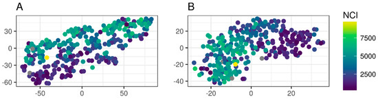 t-distributed Stochastic Neighbor Embedding (t-SNE) plots for (A) TRI patterns and (B) climate correlations with each point representing one tree. Points of more similar trees are plotted closer together and the neighborhood competition index (NCI) was used as color scale. Axes in t-SNE plots are dimensionless.