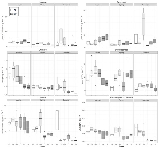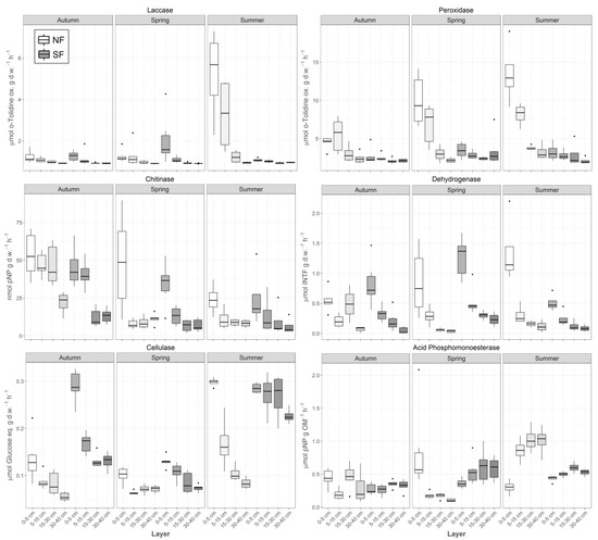 - Andersson, M.; Kjøller, A.; Struwe, S. Microbial enzyme activities in leaf litter, humus and mineral soil layers of European forests. Soil Biol. Biochem. 2004, 36, 1527–1537. [Google Scholar] [CrossRef]
