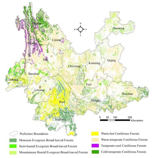 Yunnan Province is one of the most climatically and biologically diverse areas in the world and has been noted to be sensitive to climate changes []. The landform, climate, ecosystem, and species diversity of the province are higher than in any comparably sized region in China. In this study, the space-for-time method based on climax theory was adopted, which hypothesizes that forest vegetation ultimately reaches a climax status by succession []. A spatial modeling approach based on a statistically derived bioclimatic factor is used to predict and understand the vegetation distribution and CSP of projected temperature increases within Yunnan Province. Our objectives are as follows: (1) determine the changes in forest vegetation distribution with temperature increases in Yunnan Province and (2) evaluate the responses of carbon storage and sequestration potential in forest vegetation in Yunnan Province to temperature increases.