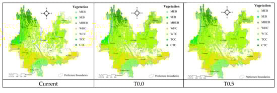 The potential distribution of forest vegetation in Yunnan Province under current and different temperature increasing scenarios. MEB: Monsoon Evergreen Broad-leaved Forests; SEB: Semi-humid Evergreen Broad-leaved Forests; MHEB: Mountainous Humid Evergreen Broad-leaved Forests; WHC: Warm-hot Coniferous Forests; WTC: Warm-temperate Coniferous Forests; TCC: Temperate-cool Coniferous Forests; CTC: Cold-temperate Coniferous Forests.