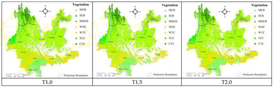 Under the T0.0 scenario, the forest vegetation ultimately reaches a climax status by succession. The entire forest area in Yunnan Province increased by 130.42% compared with the current forest vegetation distribution area. The vegetation distribution areas of the 7 selected forest types all increased under this scenario, especially WHC, which increased by 572.30%. As the temperature increased, the distribution area of all forest vegetation types (except WTC) decreased to varying extents (Table 5). The distribution area of WTC increased by approximately 30% in all of the simulation scenarios. When the temperature increased from 0.5 °C to 1.0 °C, the distribution area of MHEB decreased significantly. When the temperature increased from 1.5 °C to 2.0 °C, the distribution area of WHC decreased significantly. SEB was the forest type most sensitive to temperature, with its distribution area decreasing by more than half with a temperature increase of 0.5 °C (Figure 2). In general, the mean forest distribution area first increased and then decreased with increasing temperature. When the temperature increased by 2 °C, the mean forest distribution area in Yunnan decreased by 11% (Table 5).
