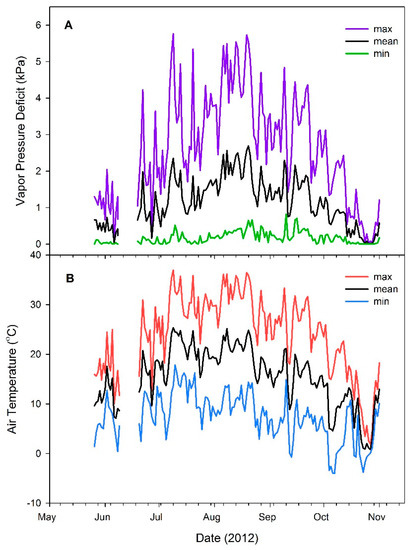 At the time of planting, air temperature and vapor pressure deficit (VPD) were 13.1 °C and 0.3 kPa, respectively. Maximum air temperature (37.0 °C) and VPD (5.8 kPa) were reached on 8 July 2011. During the study period (25 May to 31 October), air temperature and VPD averaged 15.6 °C and 1.2 kPa, respectively. Mean maximum daily air temperature for the season was 24.2 °C, with mean maximum VPD of 2.6 kPa (Figure 1A,B).